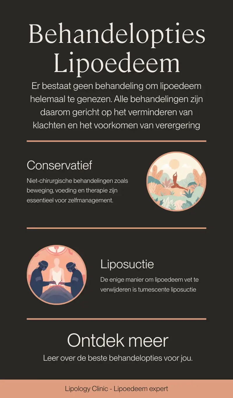 Behandelingen voor lipoedeem bestaan uit conservatieve opties (compressie, beweging, oedeemtherapie, leefstijl) en liposuctie met de tumescente techniek. Conservatieve zorg vermindert klachten; liposuctie verwijdert het vetweefsel zelf. De keuze hangt af van klachten, stadium en persoonlijke doelen.