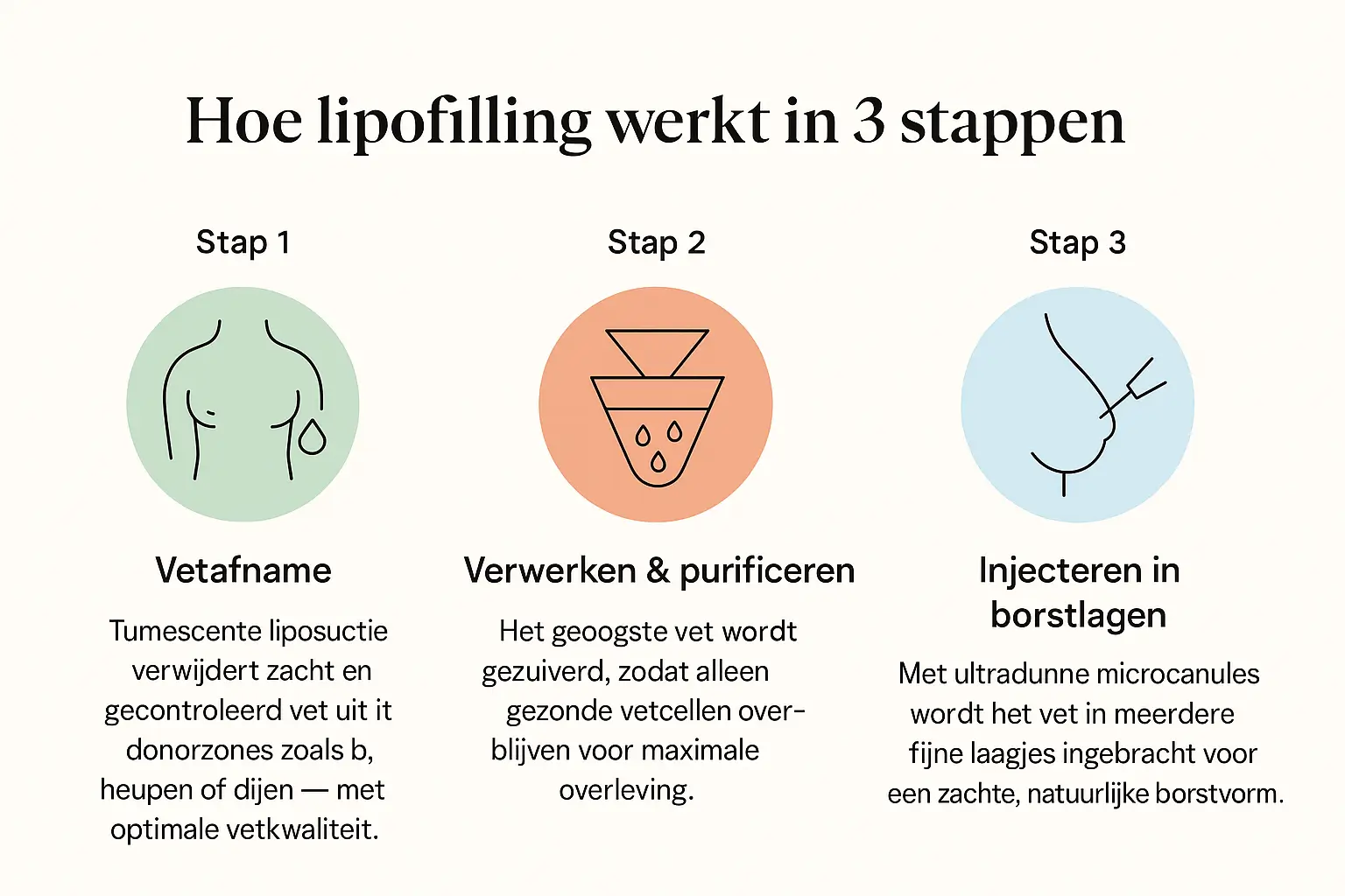 Lipofilling van de borsten is een natuurlijke vorm van borstvergroting waarbij eigen vet wordt gebruikt in plaats van borstimplantaten. Het vet wordt via liposuctie uit een ander deel van het lichaam (bijvoorbeeld buik, heupen of dijen) verwijderd, gezuiverd en daarna in de borsten geïnjecteerd. Hierdoor ontstaat een subtiele, veilige en blijvende vergroting met een heel natuurlijk resultaat. Omdat er geen lichaamsvreemd materiaal wordt gebruikt, zijn de risico’s op complicaties aanzienlijk kleiner dan bij implantaten.