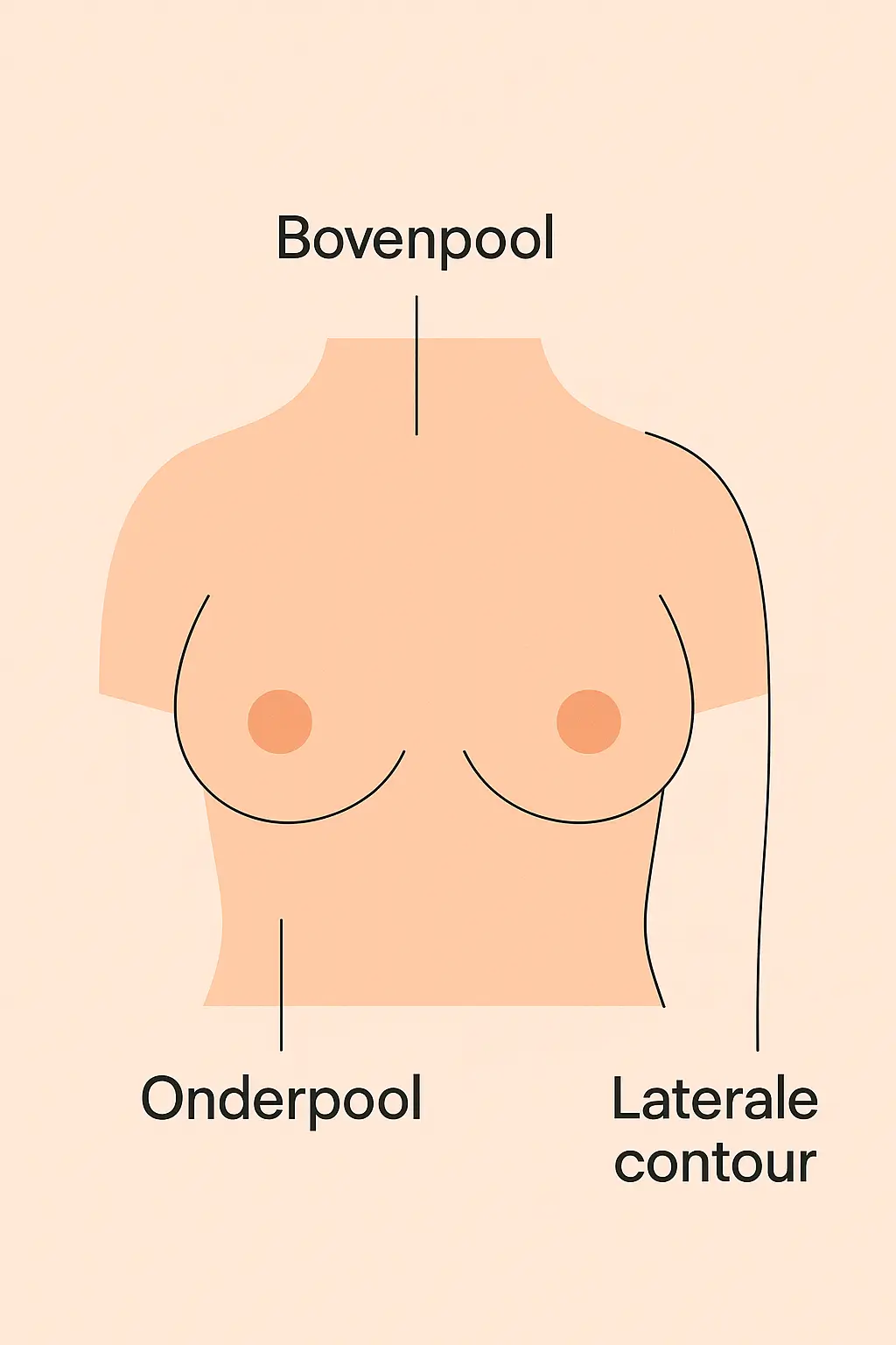 Het vet wordt zorgvuldig en gelijkmatig ingespoten in meerdere borstgebieden, zoals: